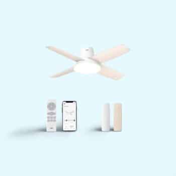 The fan is controlled by the included remote control and the iLink app for advanced features such as RGB color changing.